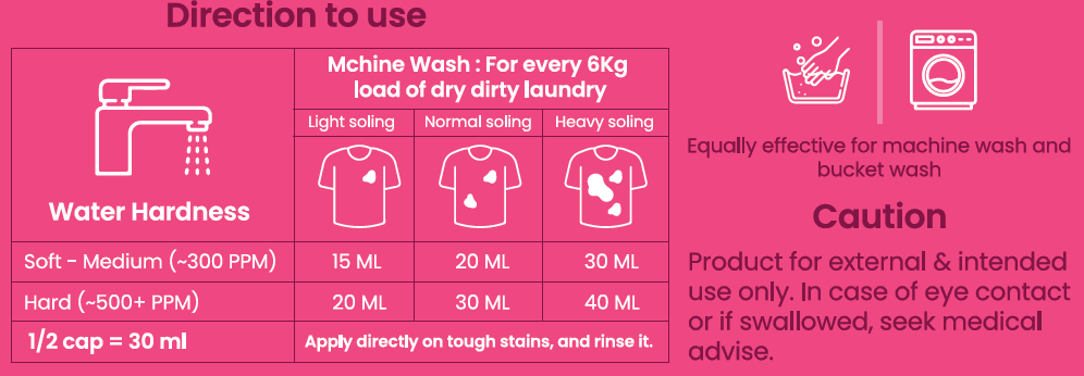 Pour 15 ml (about one capful) for a regular 6 kg load into your machine’s detergent compartment or directly onto heavily soiled clothes. For heavily soiled laundry, increase the dose to 30 ml. This powerful, concentrated formula works effectively in both front load and top load washing machines, and even for hand wash. No need for separate fabric softeners or boosters – just this one cleaner delivers deep stain removal, colour protection, and fabric care all in one go. Always store the bottle in a cool, dry place, and shake gently before use for best results.